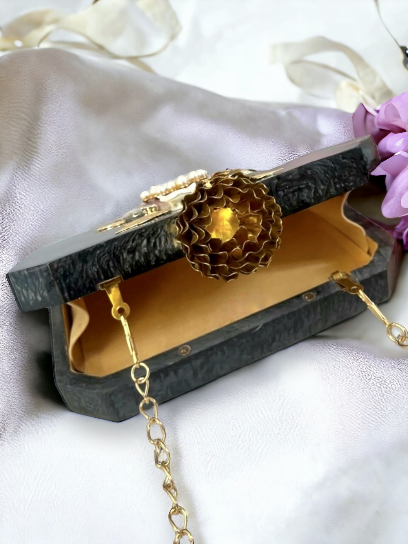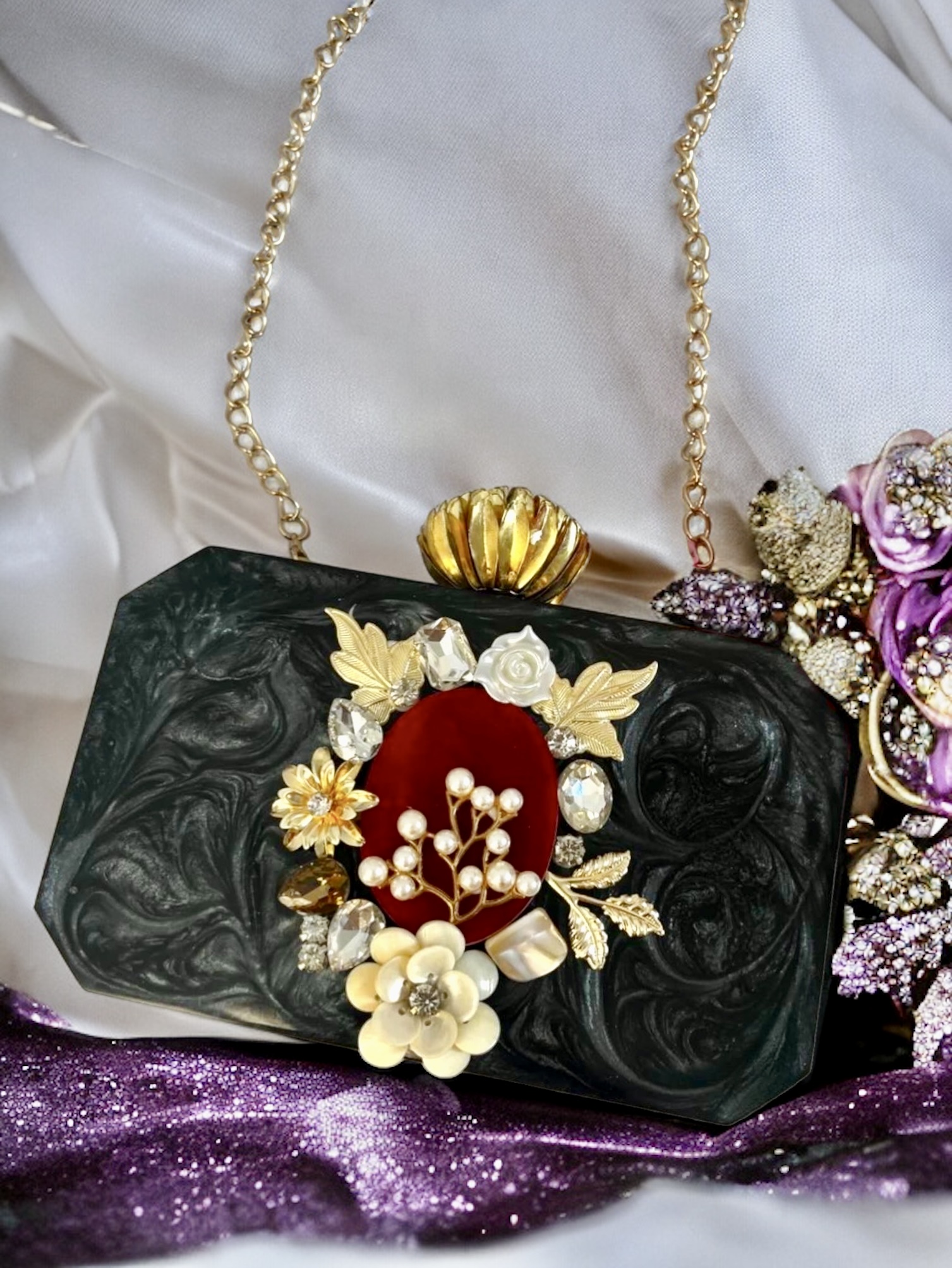 Resin clutch, Velvet lining, Pearls clutch, Stones, Bridal clutch, Flower clutch