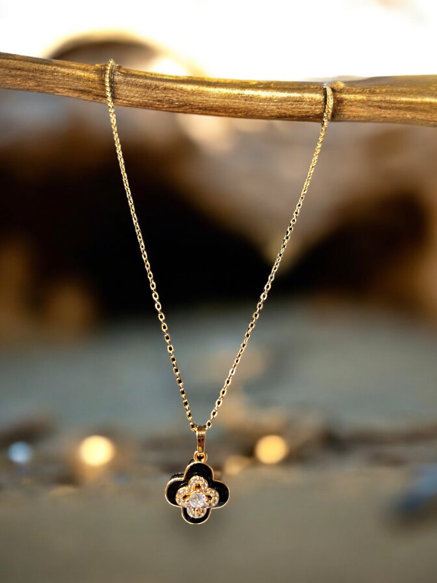 Jewel Tone chain showcases a striking black flower pendant that adds a bold contrast. The pendant spins gracefully, reminiscent of a mesmerizing spinner, enhancing the chain’s playful charm. This piece combines sophistication with a unique twist, making it a captivating accessory.