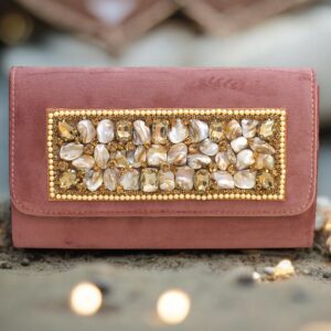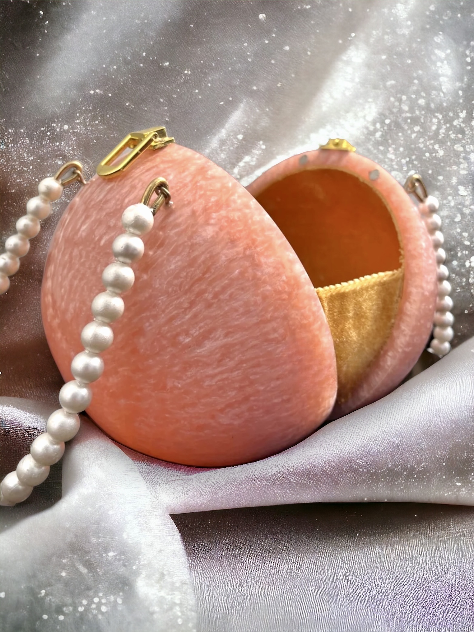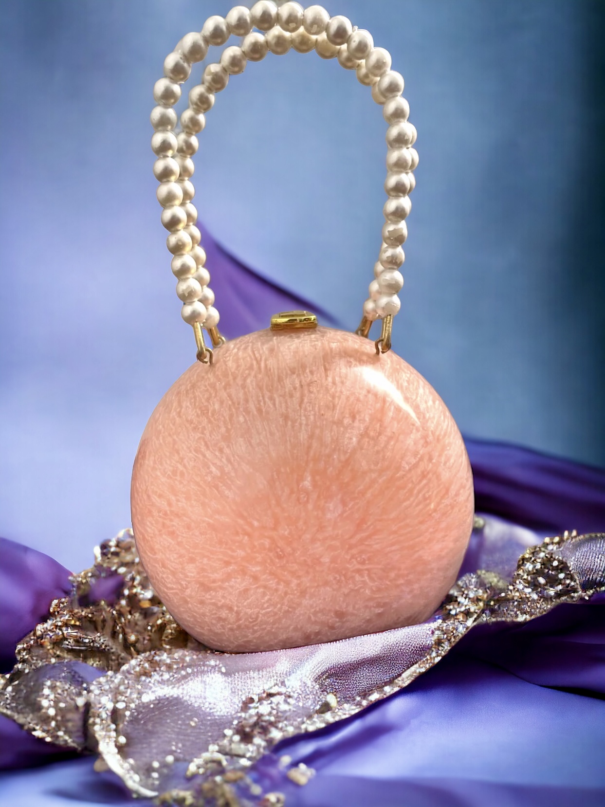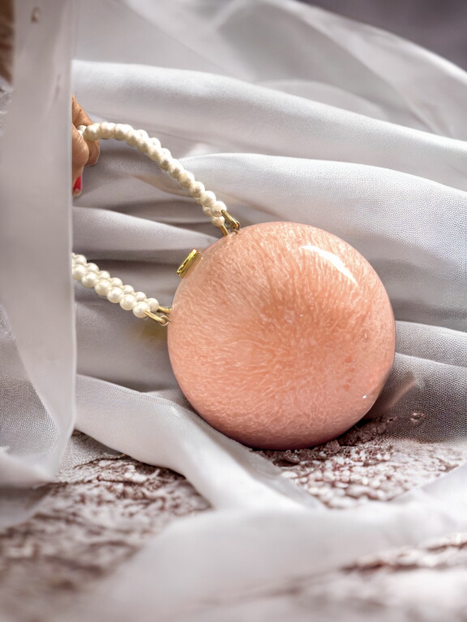 | Clutch | Glam ball, resin base, velvet lining, pearls, metal handle, marbled pattern |