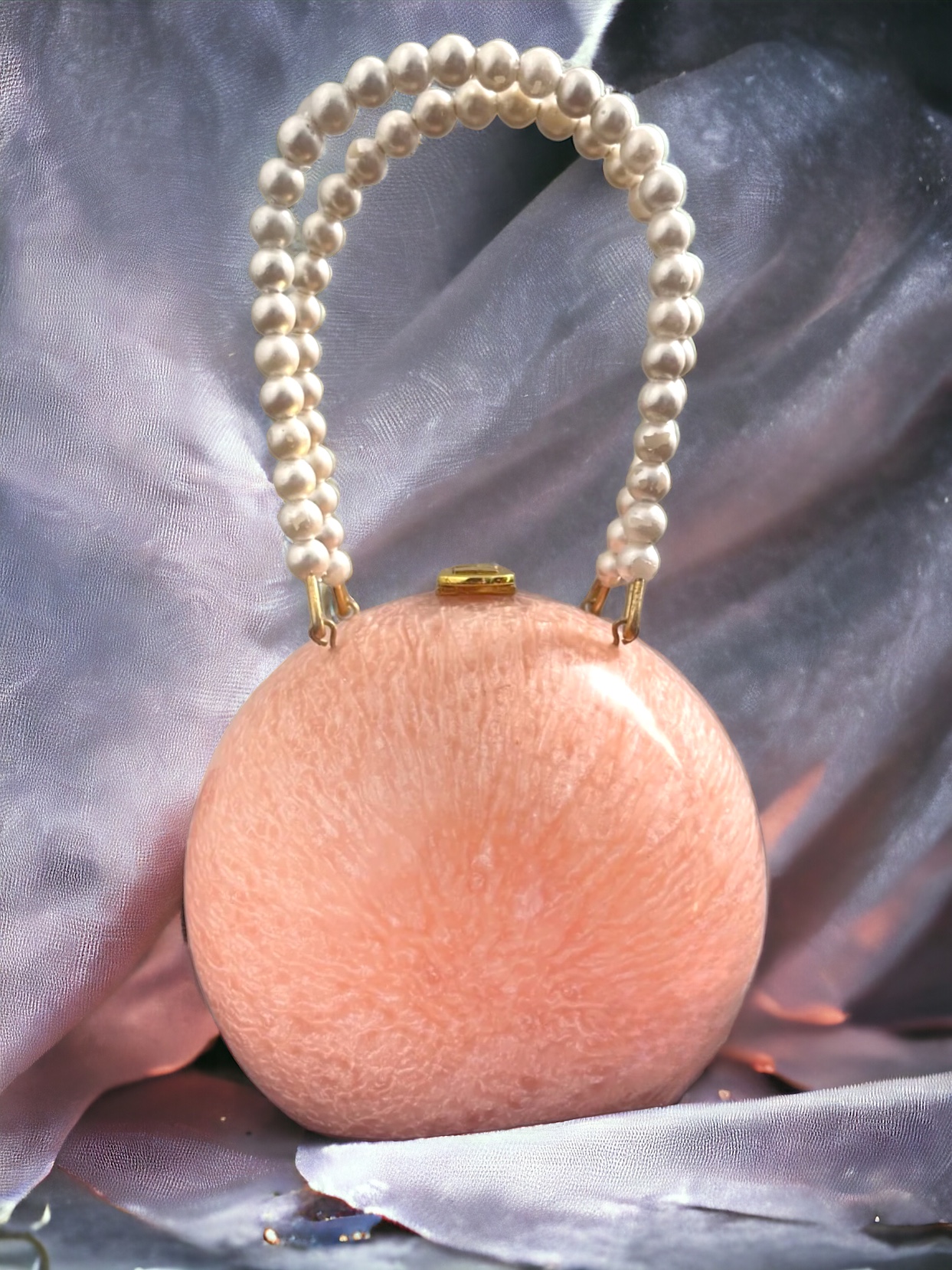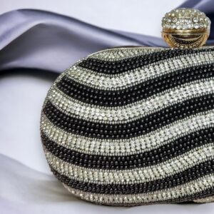 This Glam Ball Clutch is that it has a mesmerizing, marbled pattern created by the resin material, which gives it a glossy and smooth texture. It’s like carrying a piece of wearable art with you! The combination of the marbled pattern and the pearl handle adds a touch of sophistication and makes this clutch a true standout accessory.