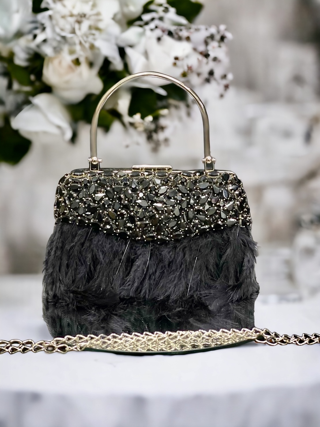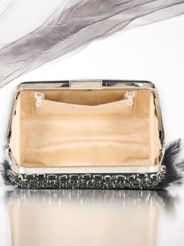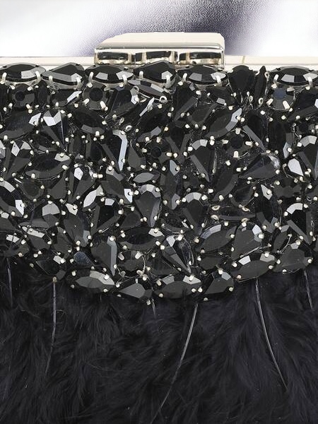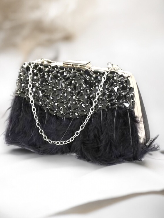 | Clutch | Handbag, black feathers, feathers, beads, clutch, bag, pearls, silk base, crystals, brass, fur |