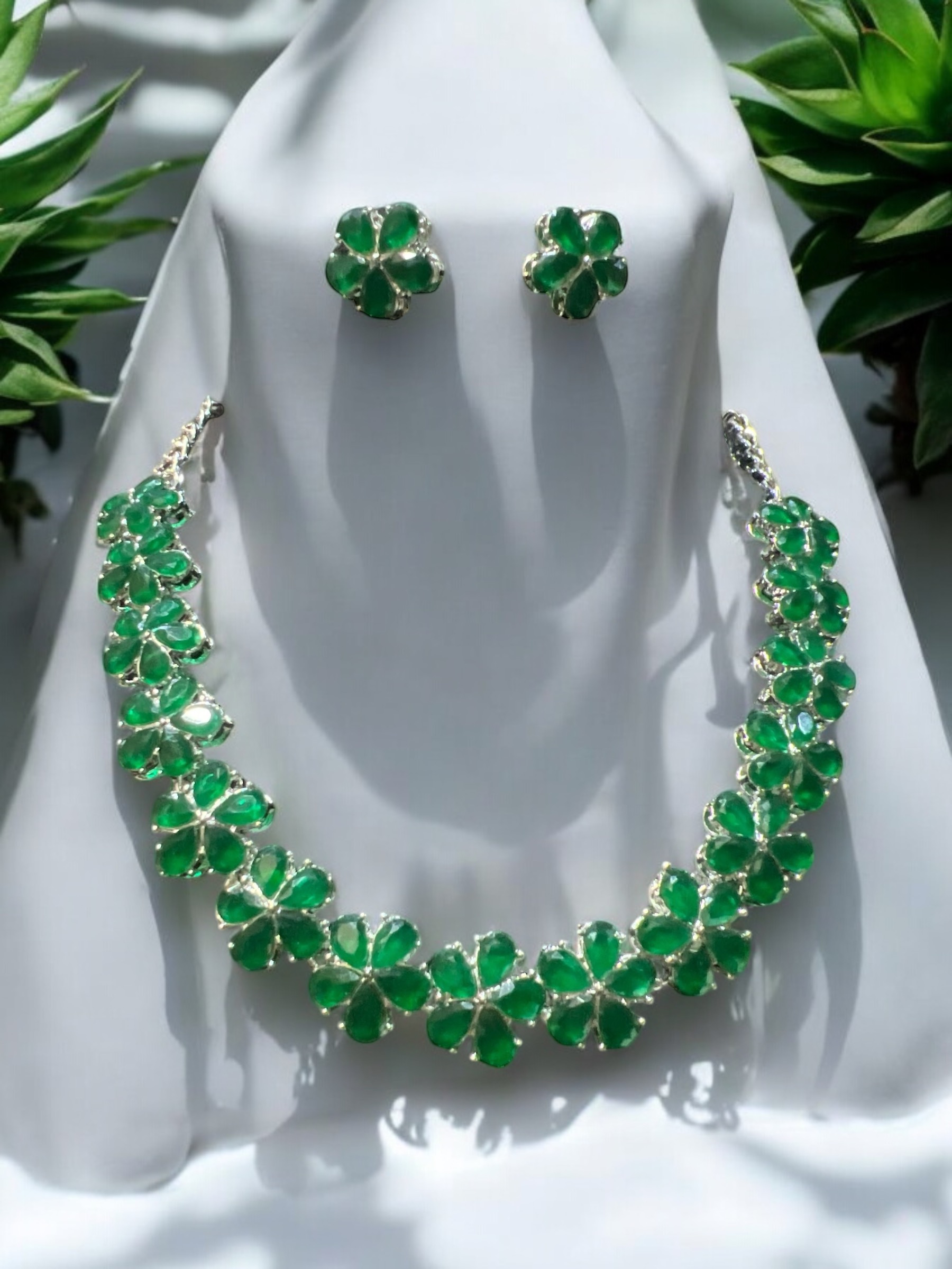 A breathtaking ensemble of delicate gold-plated metal chains adorned with kundan, shimmering beads, and pearls. The alternating beads, crafted from glass or gemstones, create a captivating pattern, varying in size and color to add depth and visual interest. Paired with Kundan dangling earrings, this set exudes unmatched elegance and sophistication, perfect for adding a touch of glamour to any occasion.