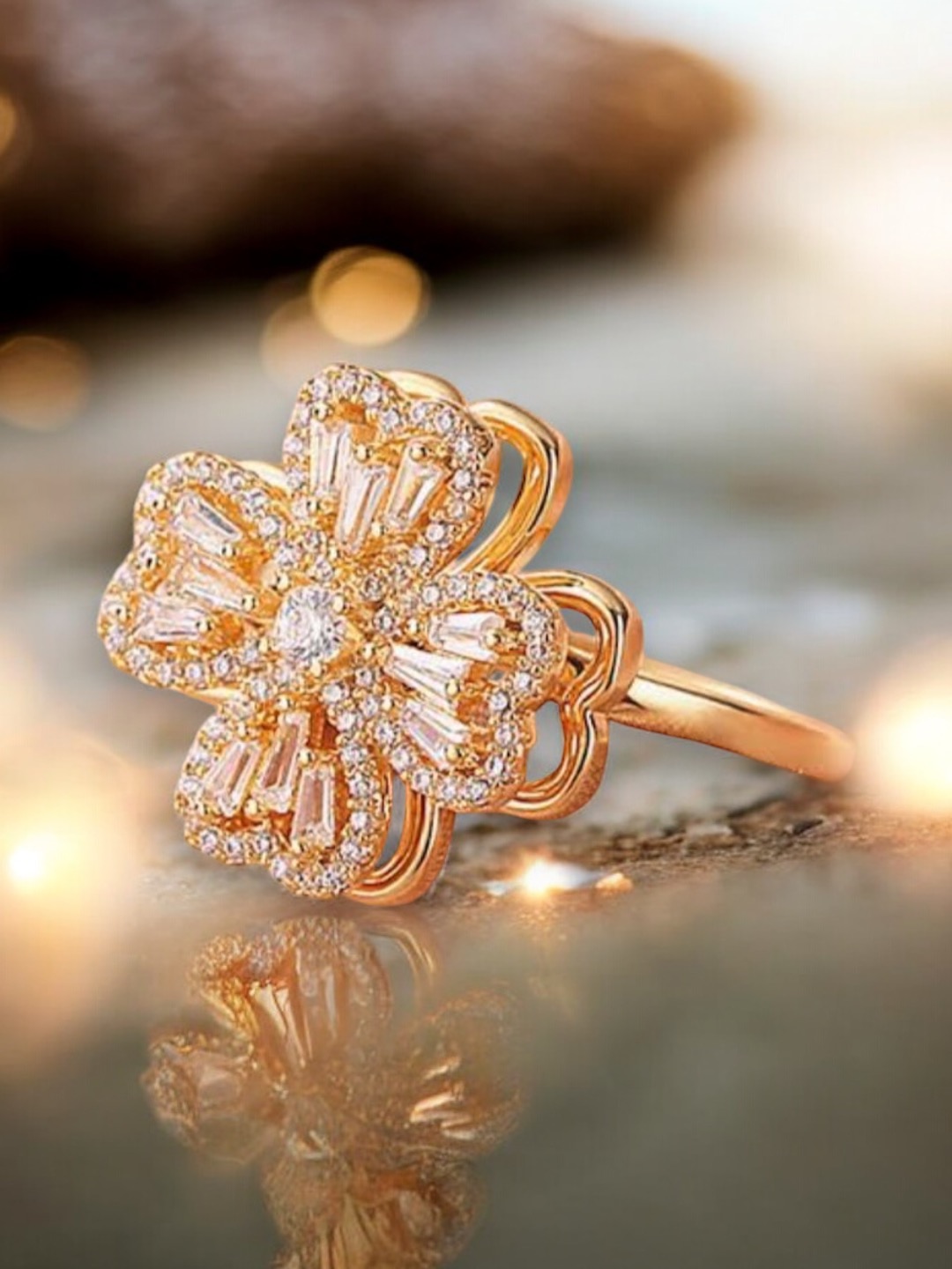 Flower Revolving Ring, bathed in a lustrous golden hue, is artfully crafted in the shape of a blooming flower. The ring features a captivating revolving mechanism, allowing the flower to spin gracefully, reminiscent of a delicate spinner. With its blend of elegance and playful design, this piece transcends traditional jewelry, inviting admiration and intrigue.