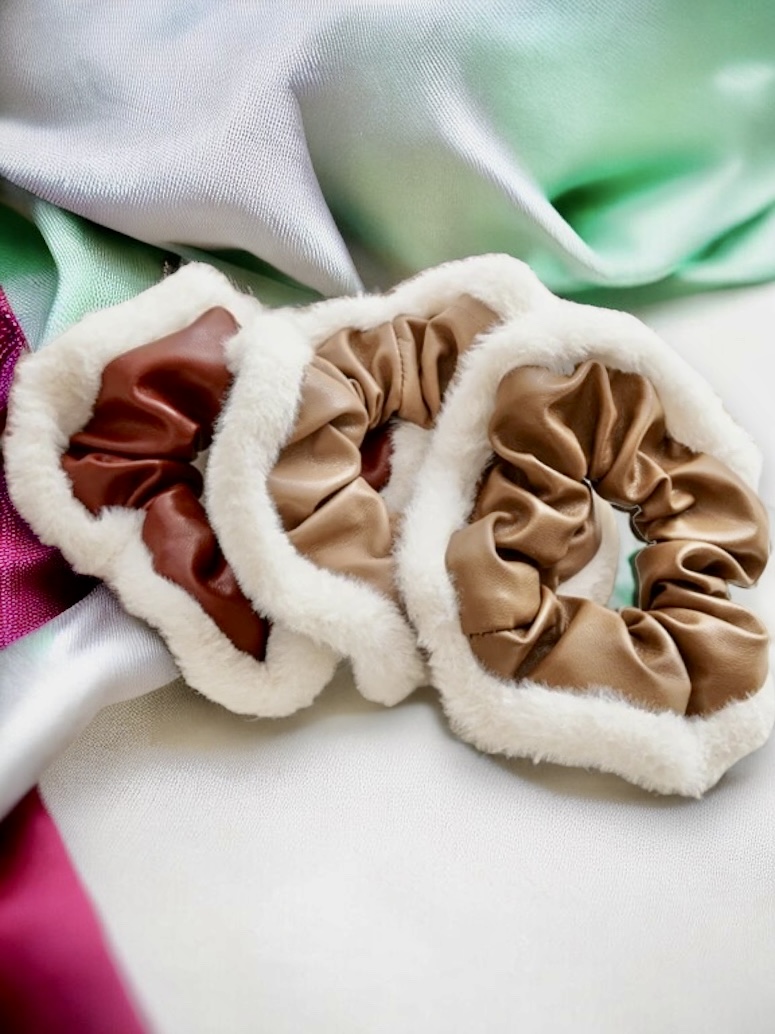Leather Scrunchies, smooth, luxurious, versatile, secure, flexible, fashion, everyday wear, maroon, brown, cream