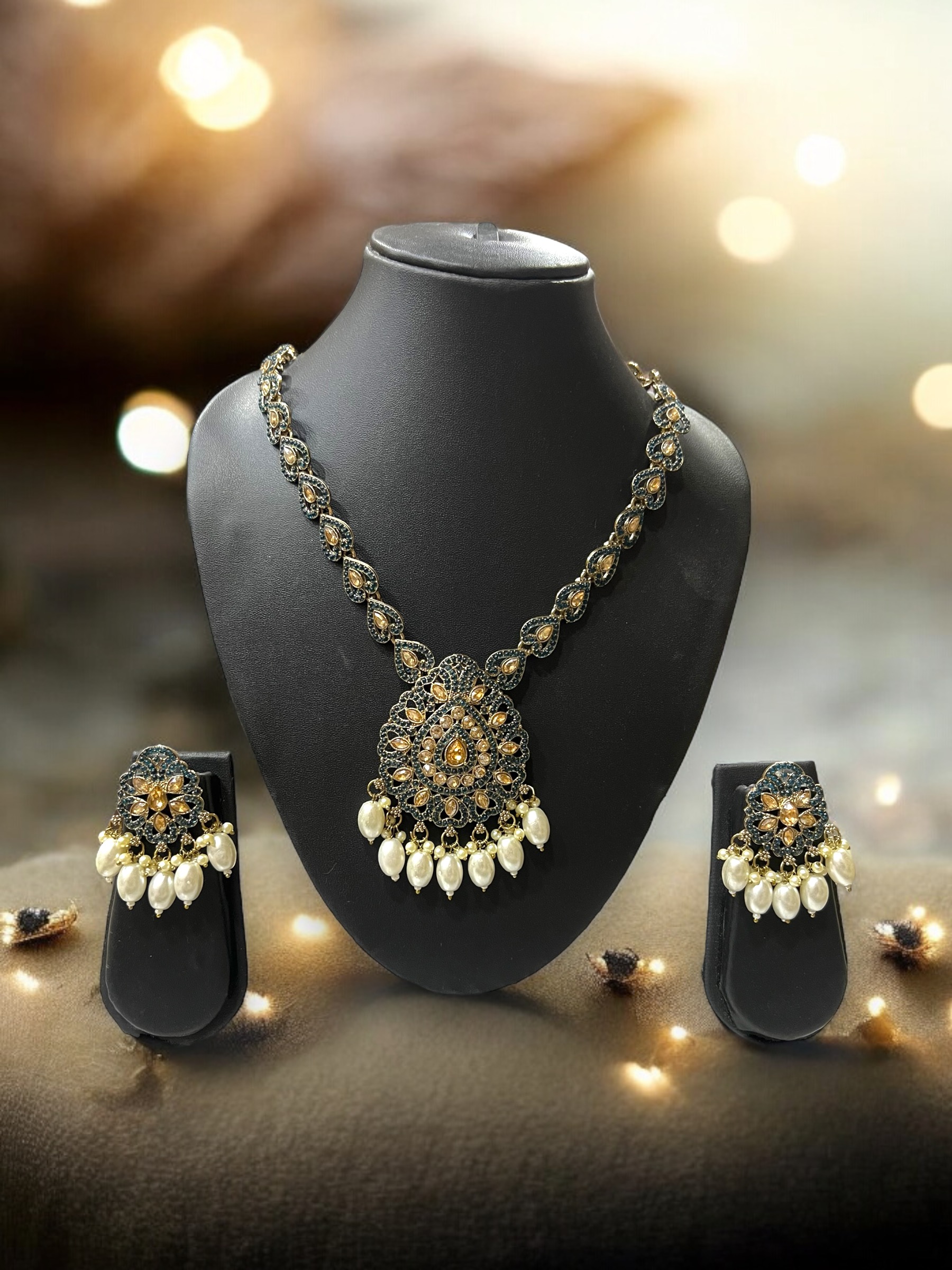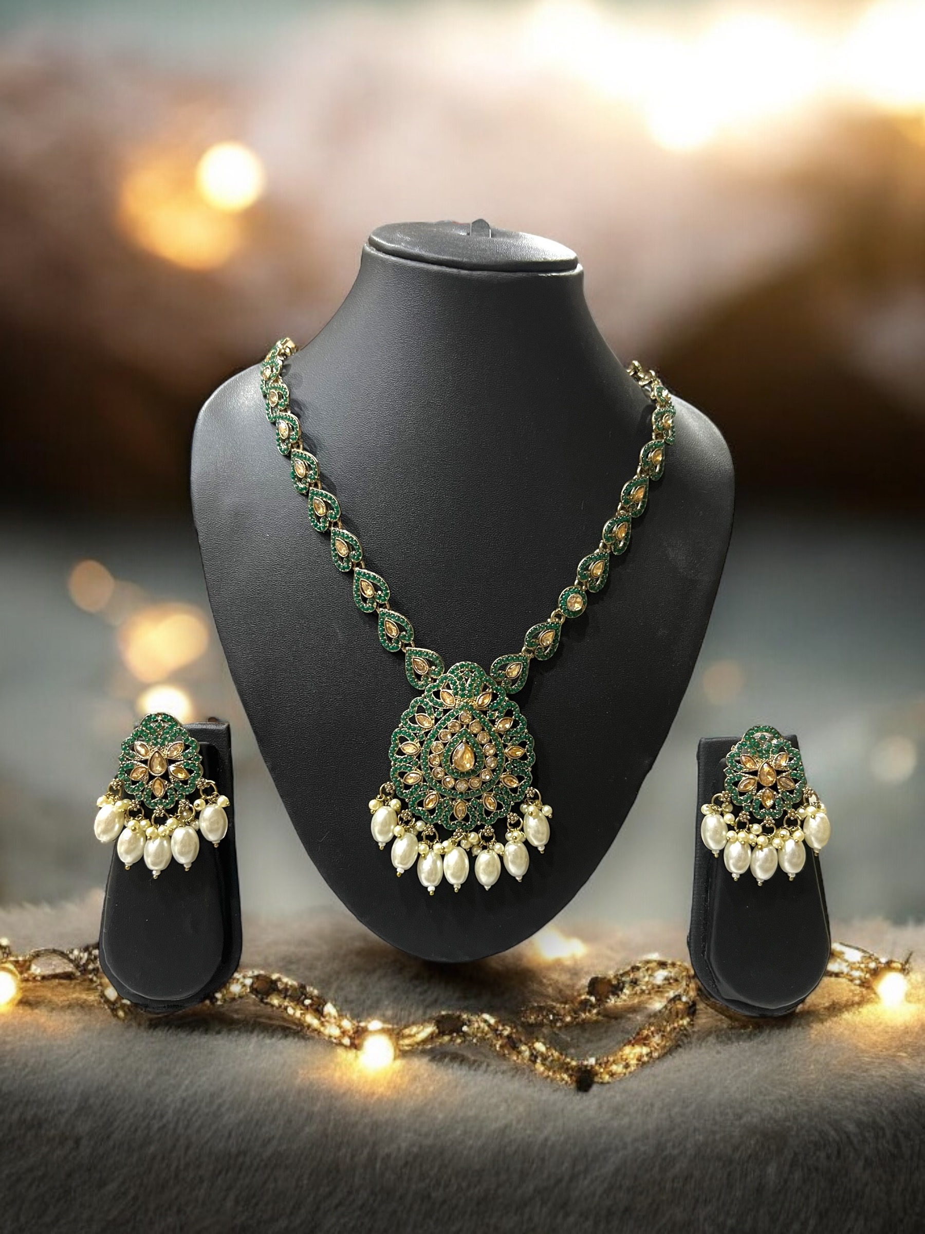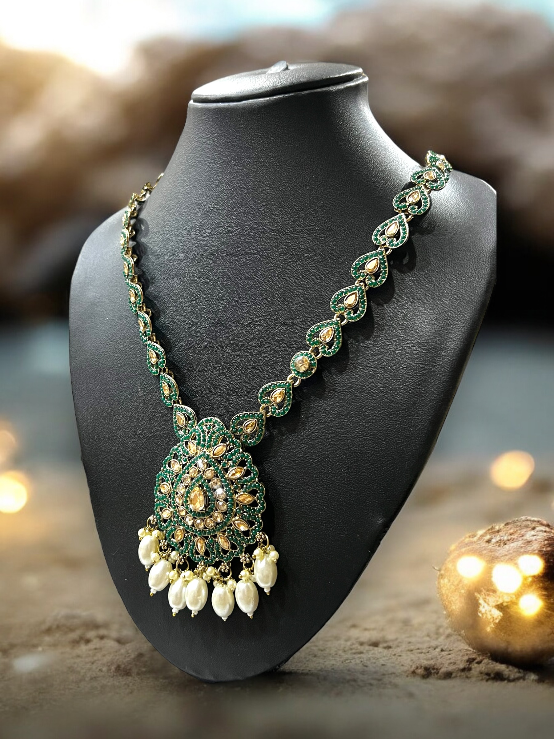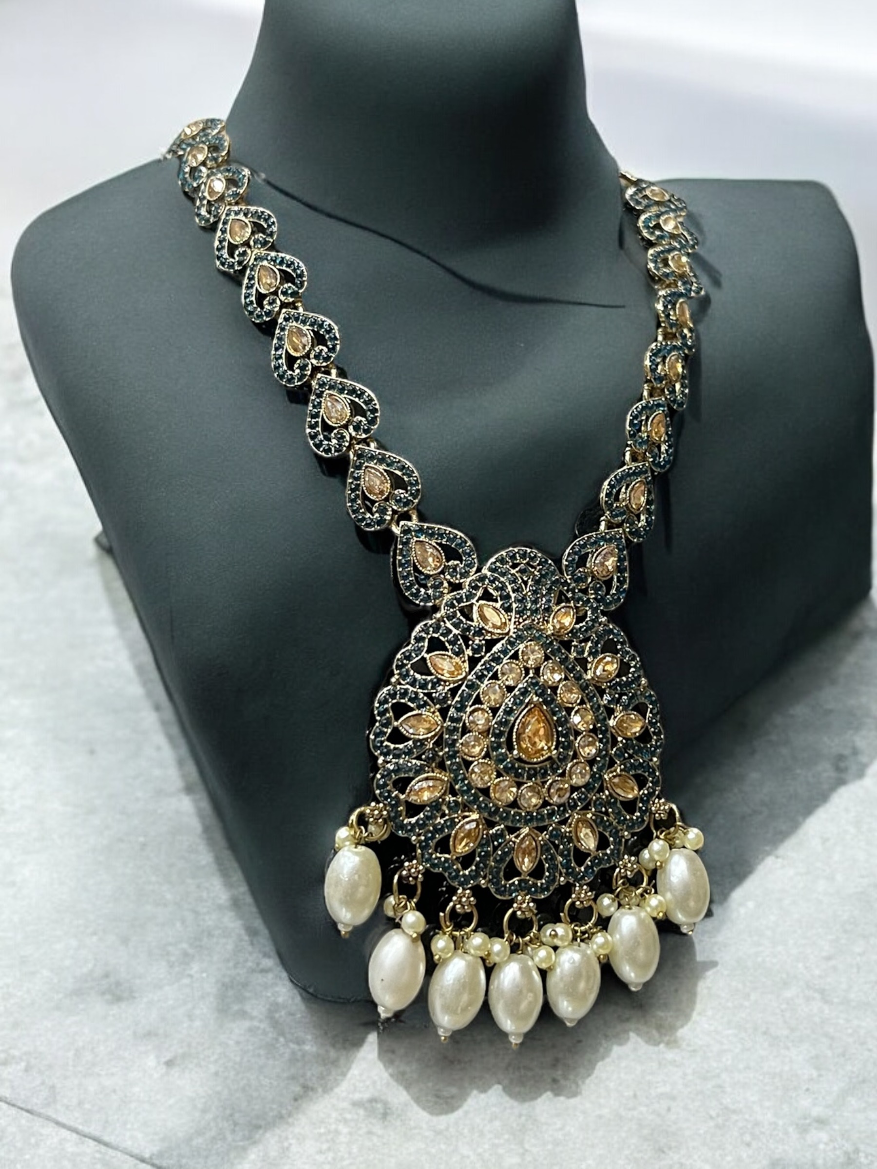 This exquisite Pakistani necklace showcases traditional craftsmanship with intricate designs and vibrant colors. Made from high-quality materials, it features beautiful embellishments, often adorned with gemstones and intricate filigree. Perfect for special occasions or festive celebrations, it adds a touch of elegance and cultural heritage to any outfit. Wear it to make a stunning statement that reflects your unique style and appreciation for artisan artistry.