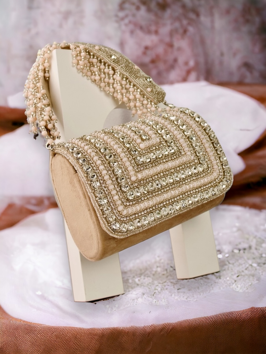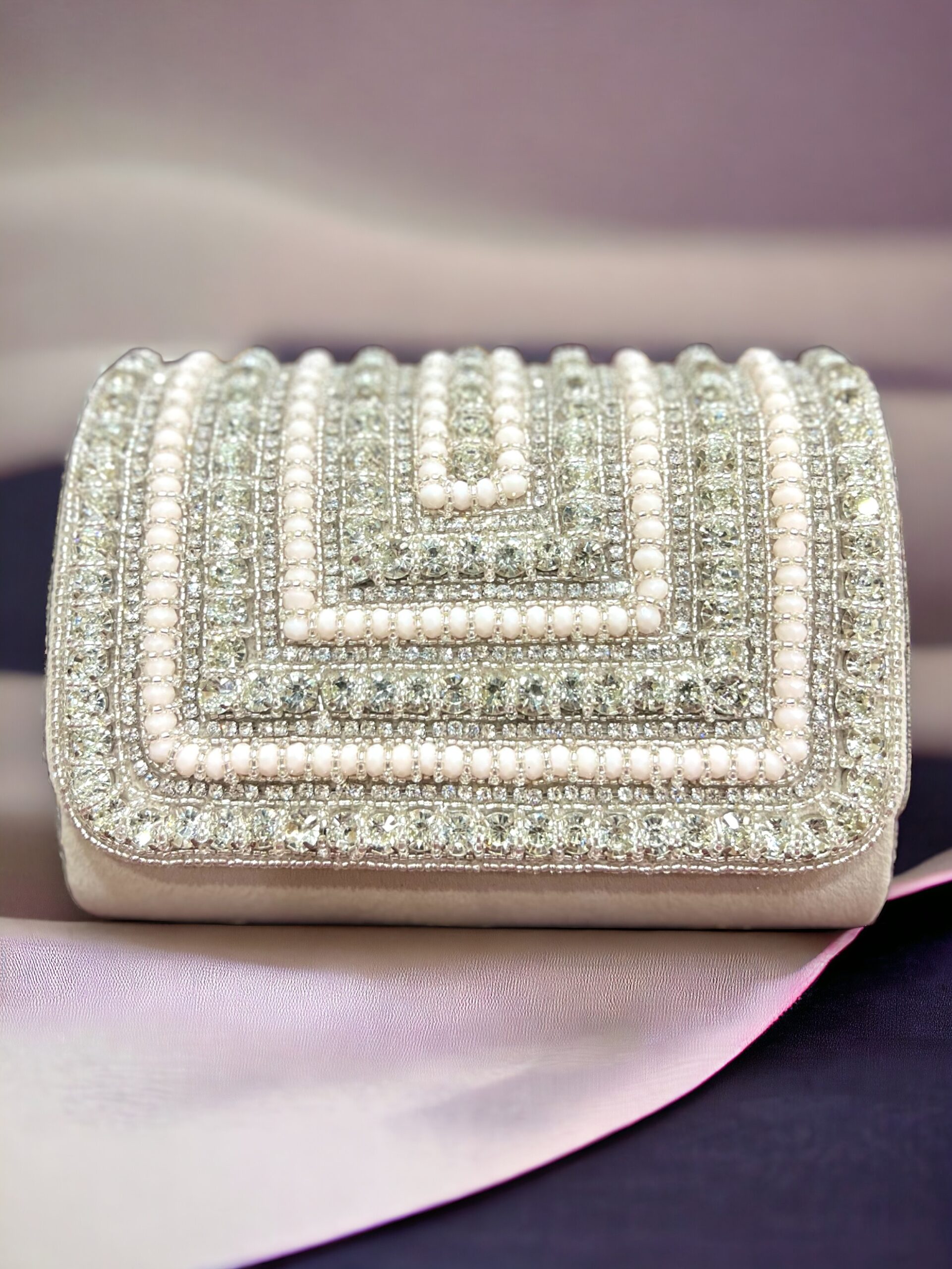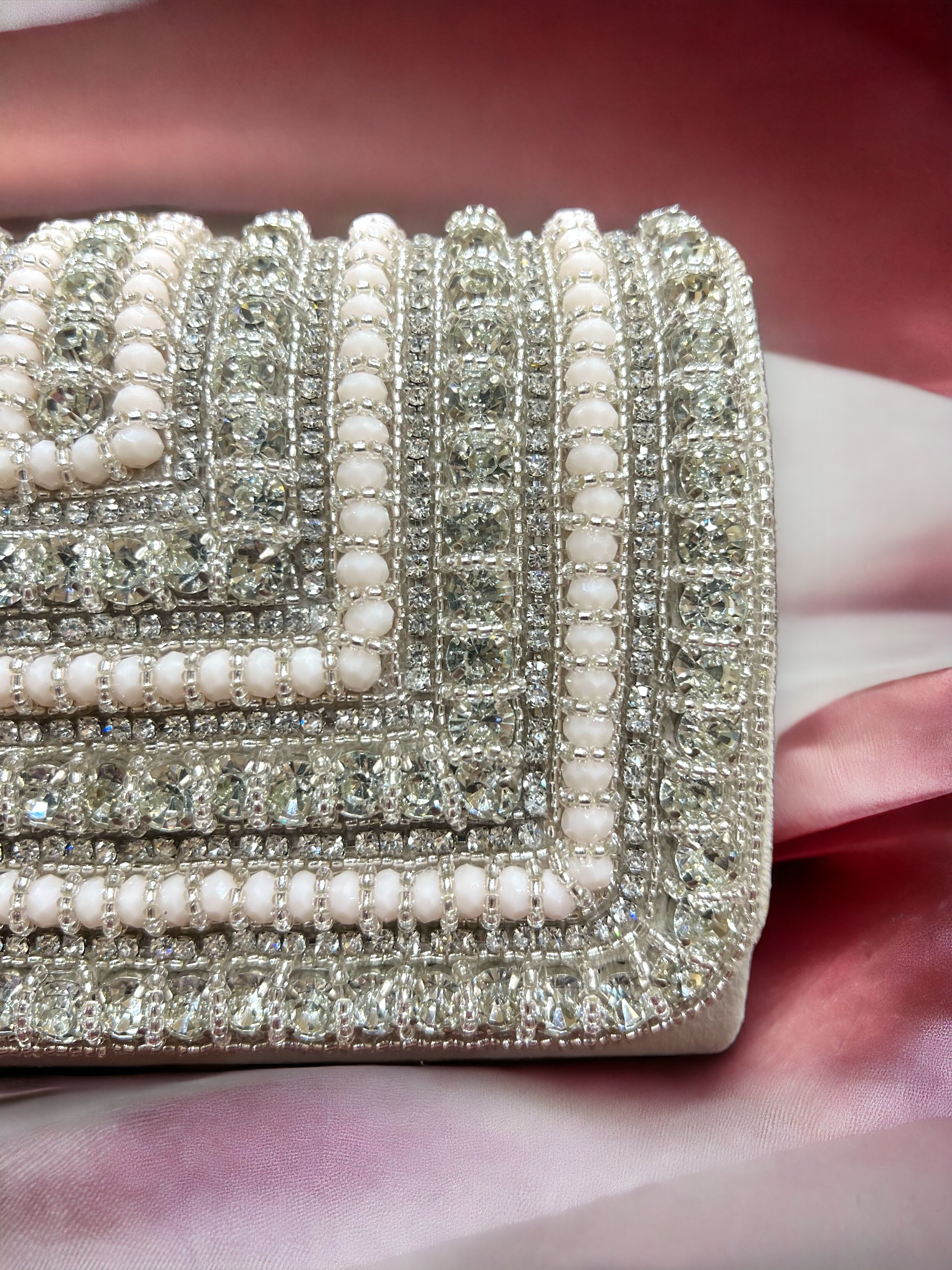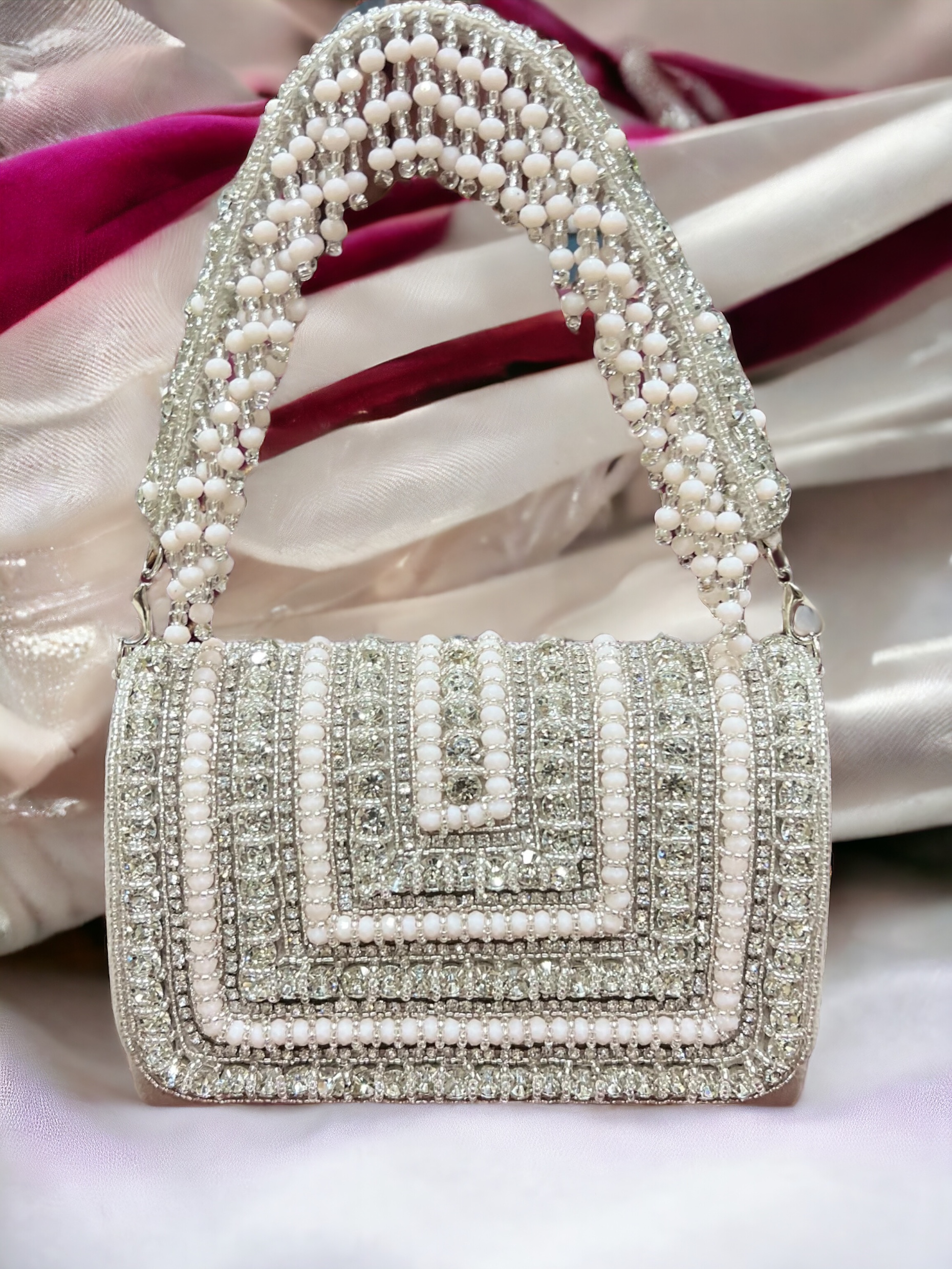 | Clutch | Pearls, Velvet Base Fabric, Silk lining, Crystals, Beads, Short Detachable Sling, Clutch, Handbag, Bag |