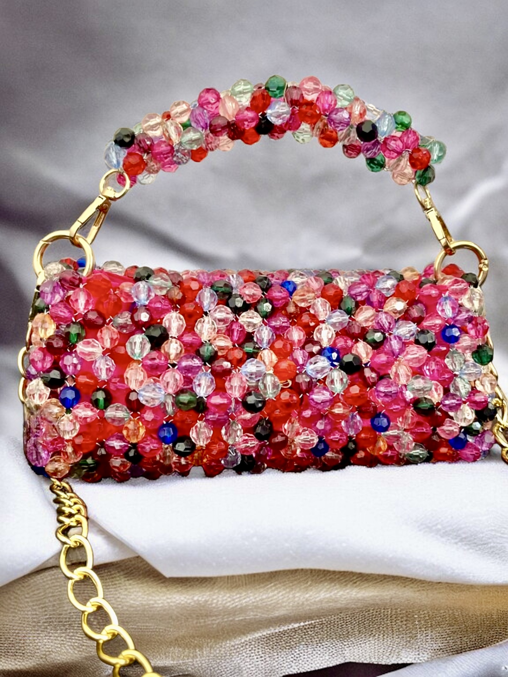 Rainbow Delight handbag is adorned with beautiful red, green, and pink crystals. They are carefully placed all over the bag, creating a stunning and eye-catching design. The clutch opens to reveal a spacious interior, lined with luxurious fabric, perfect for holding your phone, keys, and other essentials. It also features a secure closure to keep your belongings safe. it’s perfect for those late-night parties or when you want to make a bold statement. You can choose from different light patterns and colors, creating a mesmerizing effect that will turn heads wherever you go.