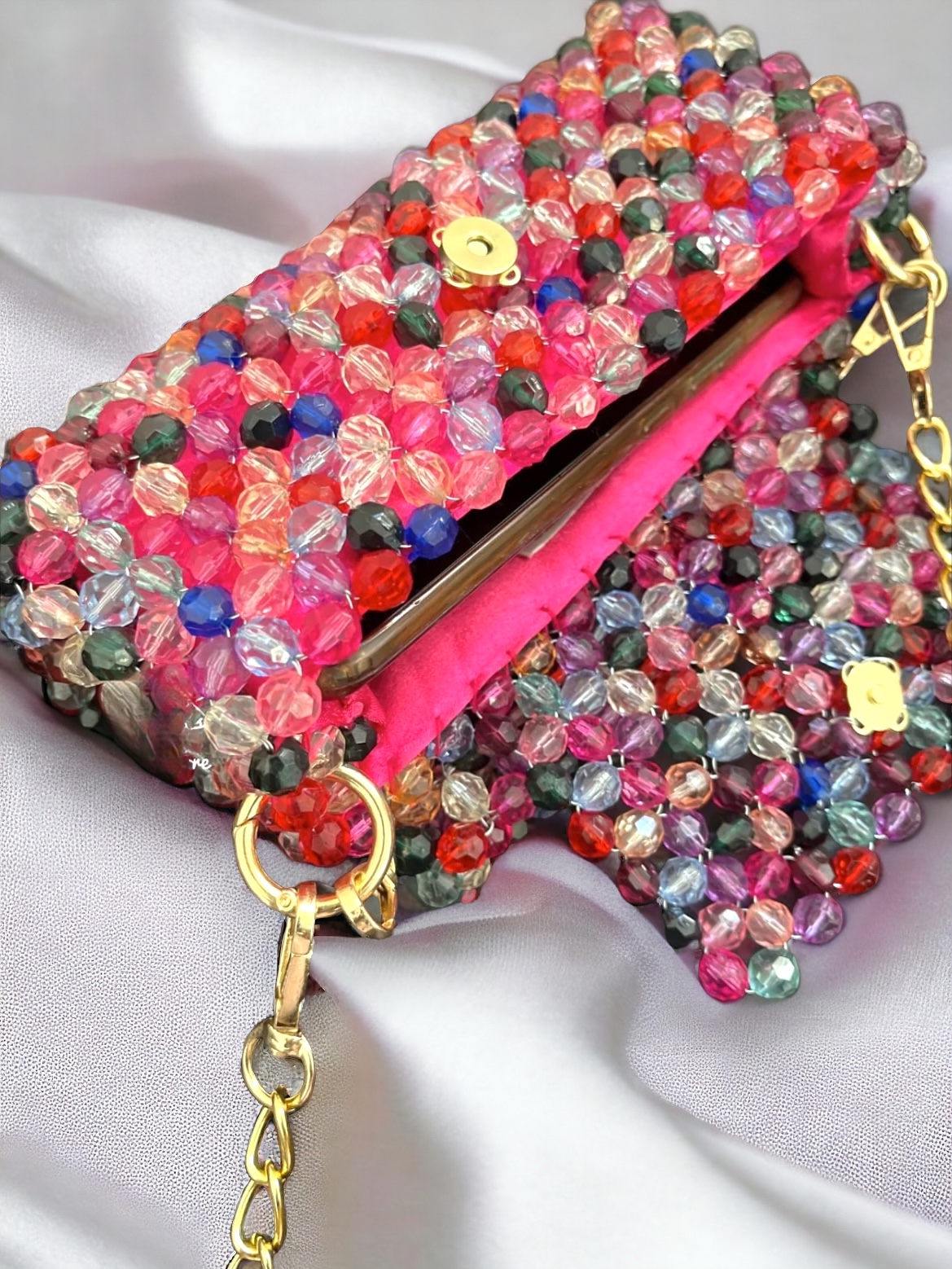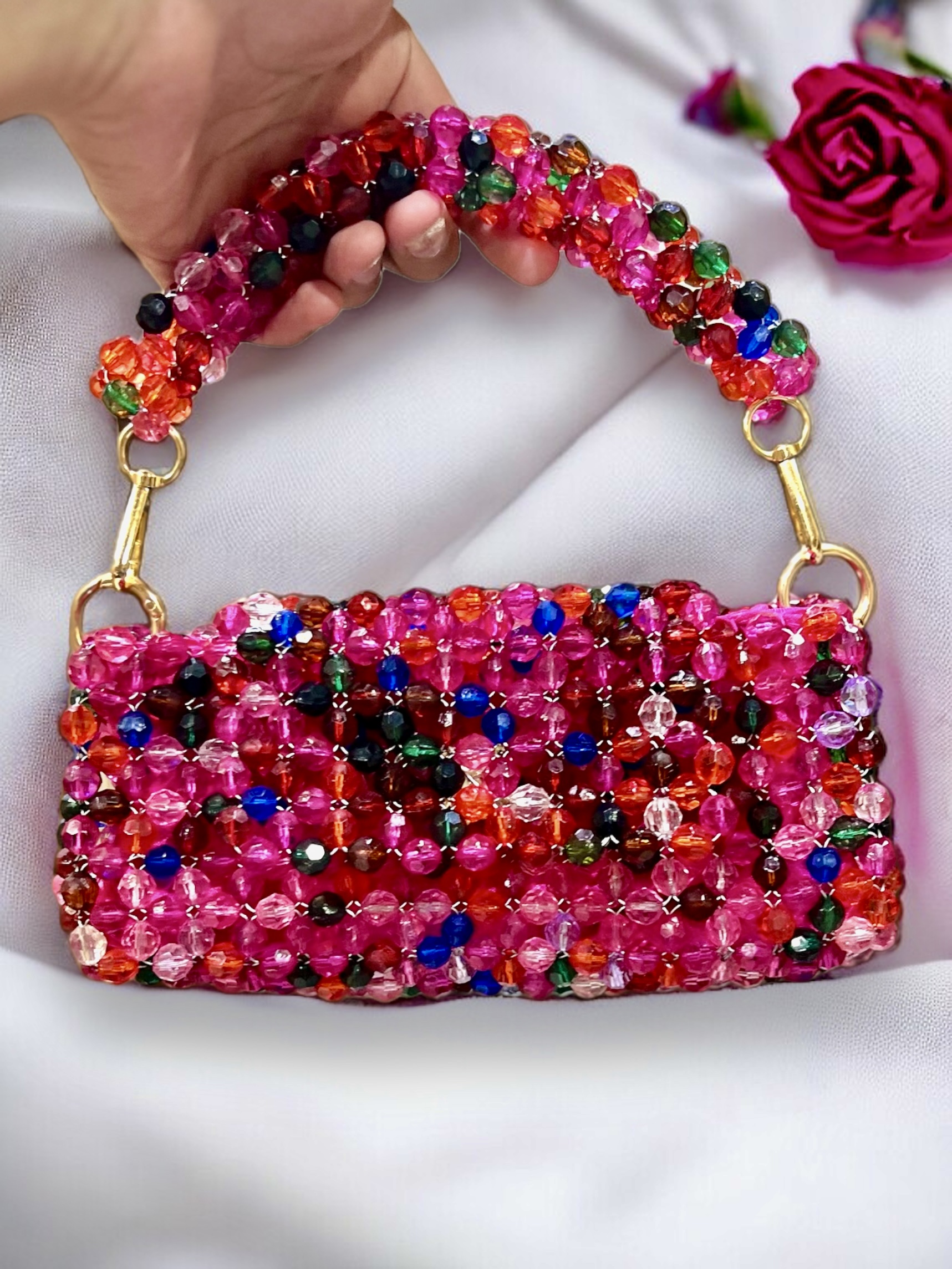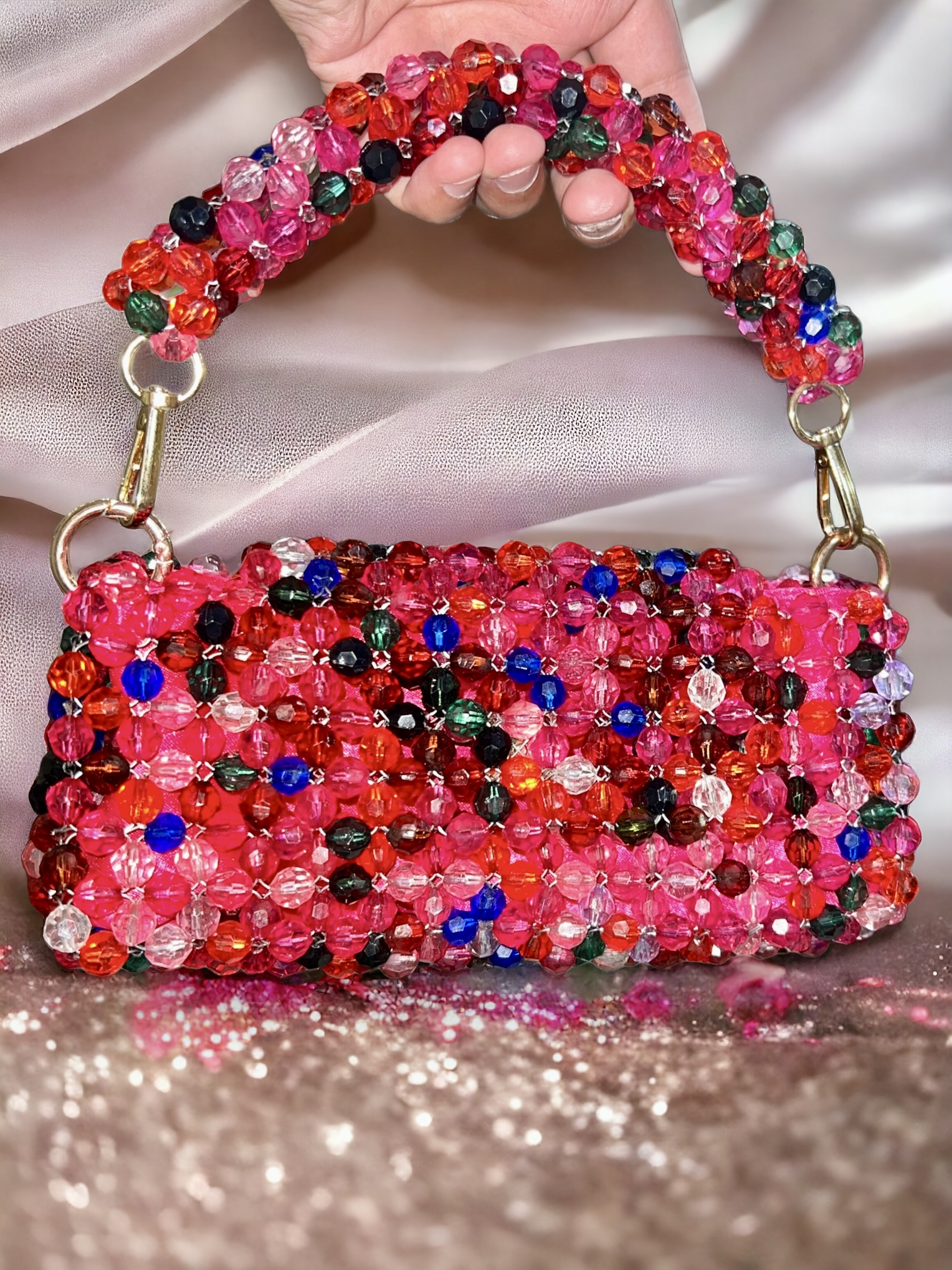Crystals, clutch, handbag, bag, rainbow, colorful, satin lining, stones, magnetic closure, short crystal handle, crystal handle