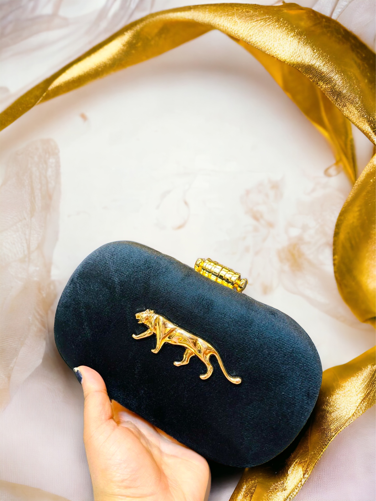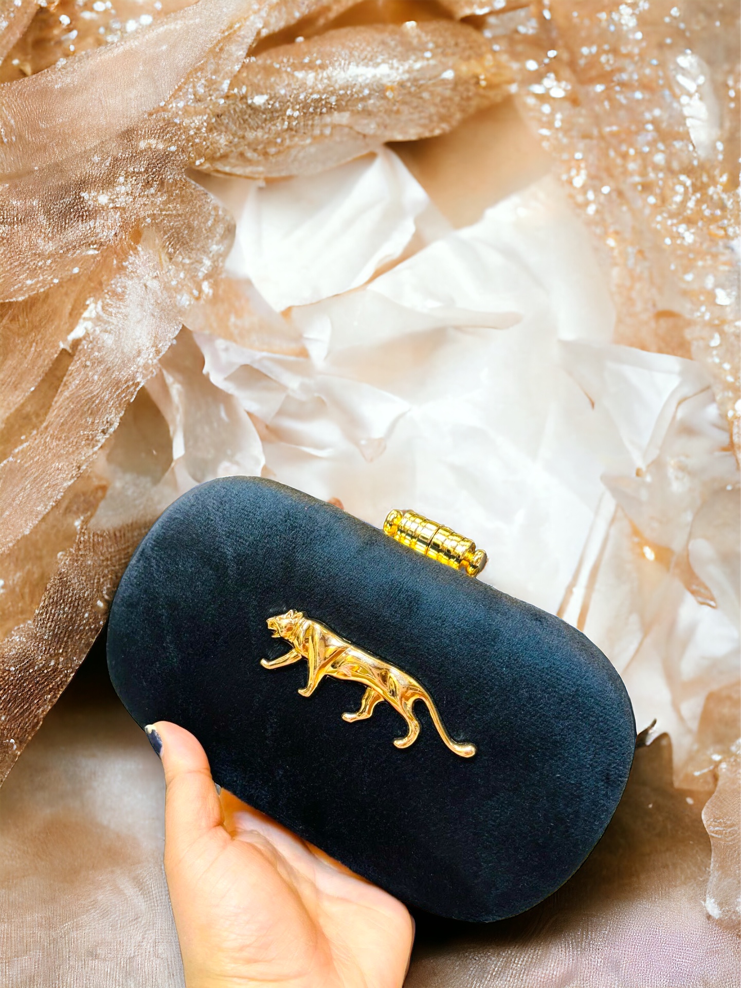 Unleash your wild side with our Velvet Roar Clutch. Featuring a black oval-shaped design, adorned with a gold-tone Royal Bengal Tiger carved logo and a stylish carved chain sling strap, it’s the epitome of sophistication with a touch of ferocity.